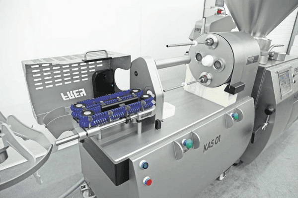 Il sistema KAS è un’alternativa al sistema precedente BAS, ed è concepito per elevate prestazioni con minimo impiego di personale. Infatti è di facile utilizzo, facile smontaggio e facile da sanificare. Con questa attrezzatura è possibile raggiungere fino a 2000 insaccati al minuto. Lunghezza e diametro degli insaccati vengono adattati individualmente per il cliente, con una lunghezza da 30 mm fino a 330 mm e un diametro da 13 mm fino a 38 mm.