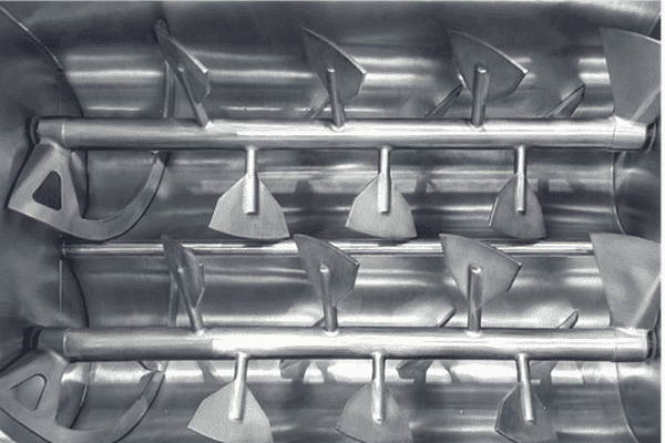 I due alberi di miscelazione con motori separati sono commutabili indipendentemente in avanti e indietro, ad alta e bassa velocità, permettendo così la più adatta miscelazione per il prodotto. Di serie gli alberi di miscelazione sono dotati di palette e/o spirali parziali che consentono uno svuotamento rapido. Lo scarico del prodotto avviene attraverso alette di scarico idrauliche.